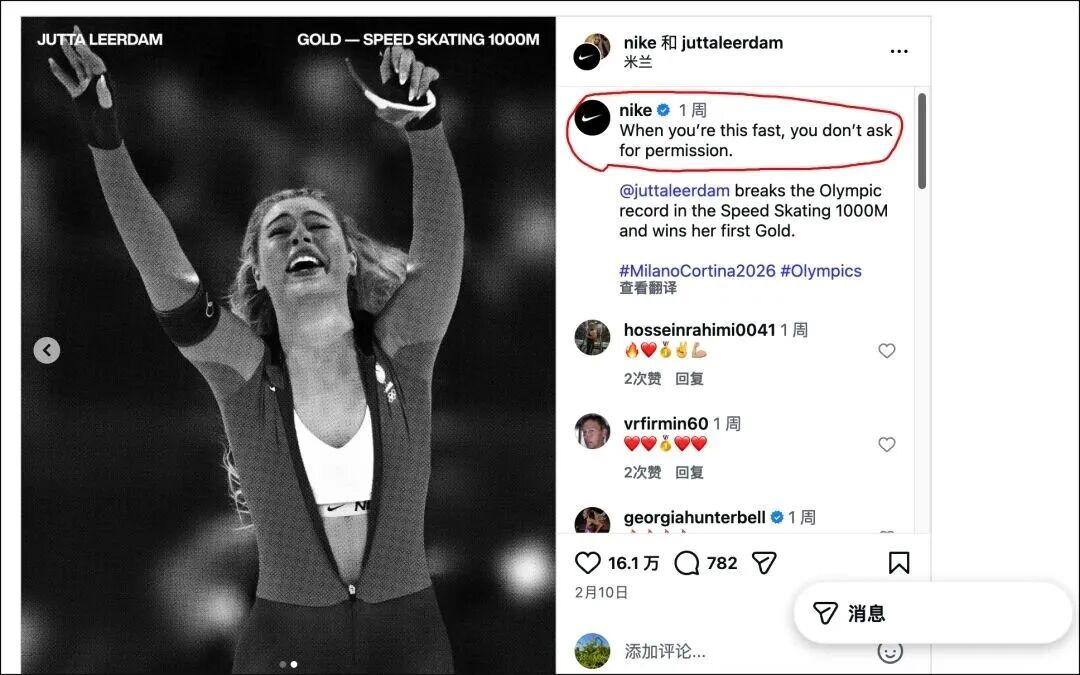 作为耐克签约运动员,莱尔丹日常便穿着该品牌贴身装备,此次举动并无刻意营销之嫌,更多是夺冠后情绪宣泄的自然流露。但这一偶然瞬间,却为耐克带来了难以估量的曝光效应,莱尔丹自身拥有620万社媒粉丝,耐克全球近3亿粉丝的官方账号同步转发,曝光量远超常规广告投放,被业内称为“最划算的伏击营销”。